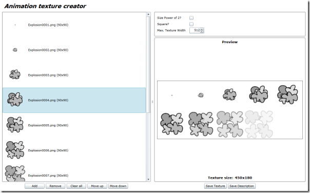 The right half of the application offers a few options to influence the texture creation. You can choose to make the texture size a power of two (which for example is required for DXT compression). If you uncheck that option, the maximum texture width setting is used instead to force "line breaks" in the layout of the source images. You can also choose to create the texture as square format here.