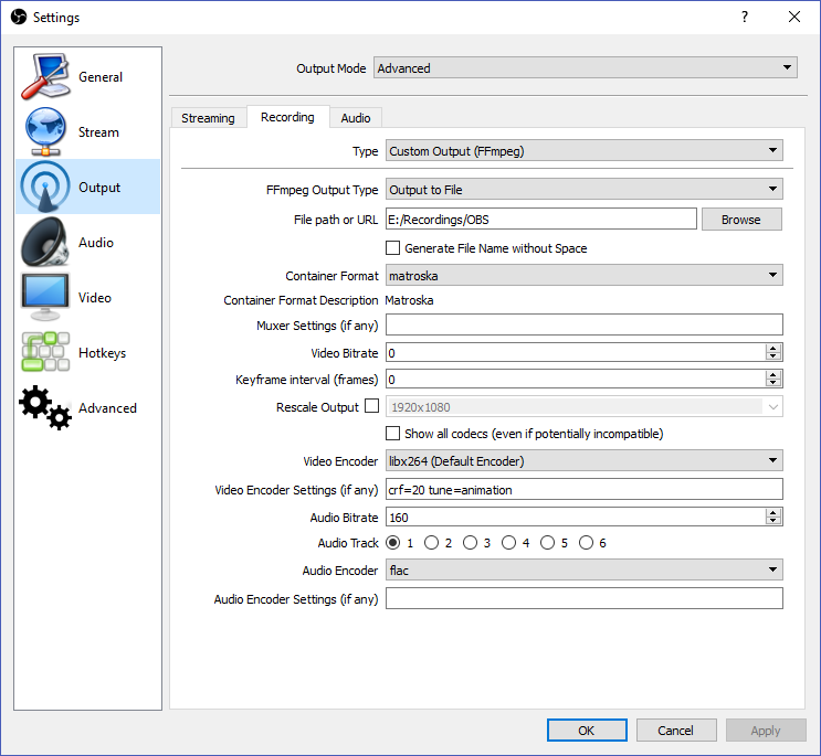 The container format is set to "matroska" (MKV), because that's a very robust and flexible option. As video encoder I chose "libx264" (H264). You can try to use the built-in support for hardware encoders here, for example nVidia's NVENC ("h264_nvenc"), but in my experience x264 can be encoded in realtime without any problems on modern hardware with very low CPU load, and I've come across quality issues with hardware encoders in the past.