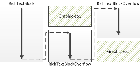 Chaining these elements together is actually pretty trivial. The original "RichTextBlock" has a new property named "OverflowContentTarget" that takes the follow-up element, which is a "RichTextBlockOverflow". That type in turn has the same property that allows chaining multiple overflows. If you set up the layout in XAML rather than in code, then it's likely that you use element bindings for this: