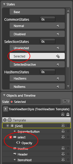 In the current case, after inspecting the available states you'll find out that there are two rectangles ('select' and 'inactive') in this template, which are made visible in the 'Selected' (and 'SelectedInactive', respectively) state by manipulating their opacity property. We just wanted to remove those effects completely, so I simply deleted both rectangles. If you wanted to adjust the colors or other parts of the effects' appearance, that's the place where you would do that too.