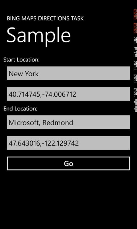 The next version of Windows Phone 7 will introduce a set of new tasks that allow your applications to launch and use additional built-in features of the phone. One of these tasks is the BingMapsDirectionsTask. Unlike the task we've looked at in the previous post that allows you to center the map on a specific location, this one supports a start and end location to display turn-by-turn driving directions.